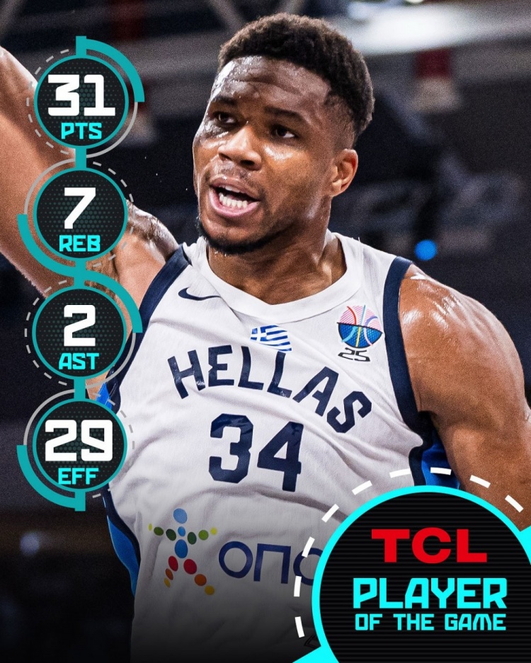 本场比赛中,希腊队核心"字母哥"扬尼斯-阿德托昆博表现抢眼,在29分02秒的出场时间内高效斩获31分7篮板2助攻1抢断,投篮20投14中,罚球4中3,但同时也出现5次失误,个人正负值为-3。